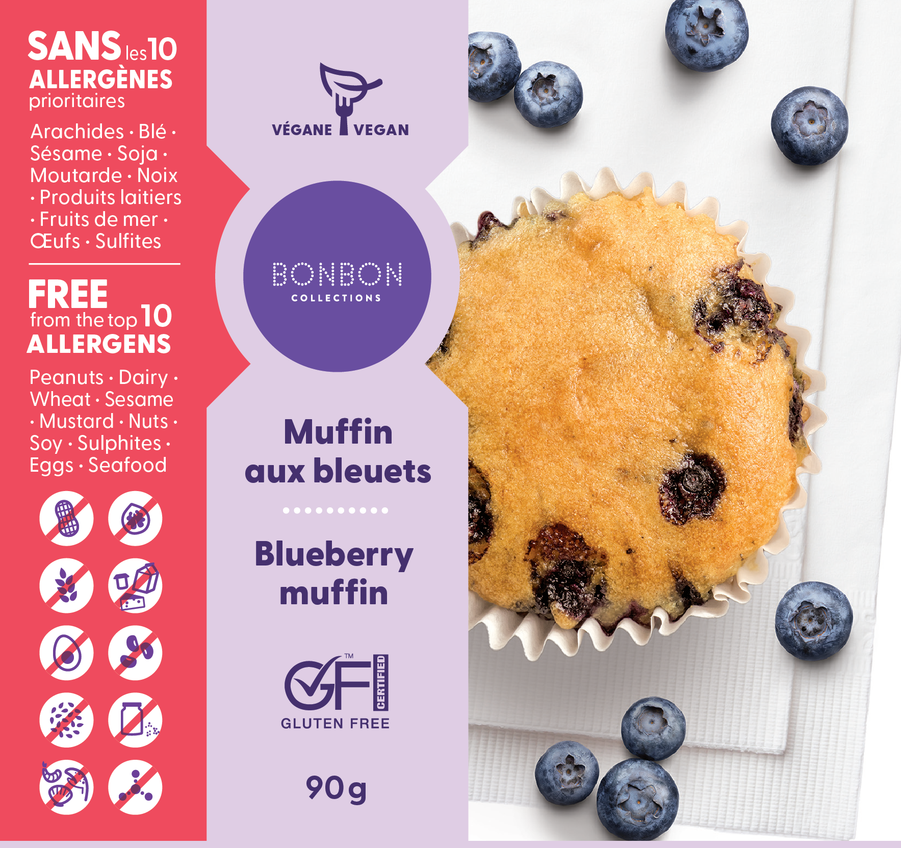 Our blueberry muffins offer a divine experience, being gluten-free, allergen-free, and completely vegan. Perfect for a delightful snack to take with you wherever you go. Let yourself be seduced by these fruity and flavorful delights, an irresistible indulgence for your taste buds!